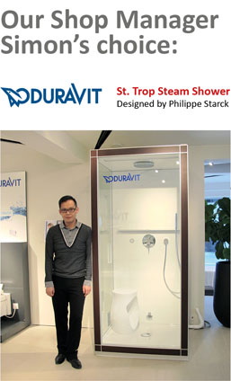 Simon: Duravit "St.Trop", the steam shower cabin designed by Phillipe Starck. I find that this steam cabin is quite convenient and space-saving. It doesn't require too much space to install with a very edgy design. |